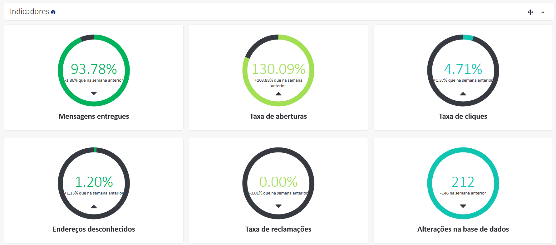 Dentro do período da última semana, visualizamos a quantidade de mensagens disparadas, o quanto foi aberto do que foi disparado, o quanto foi clicado daquilo que foi aberto, etc. Há também uma comparação entre os últimos 7 dias e a semana anterior a esse período.