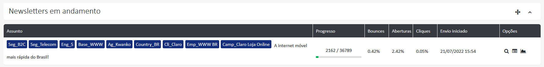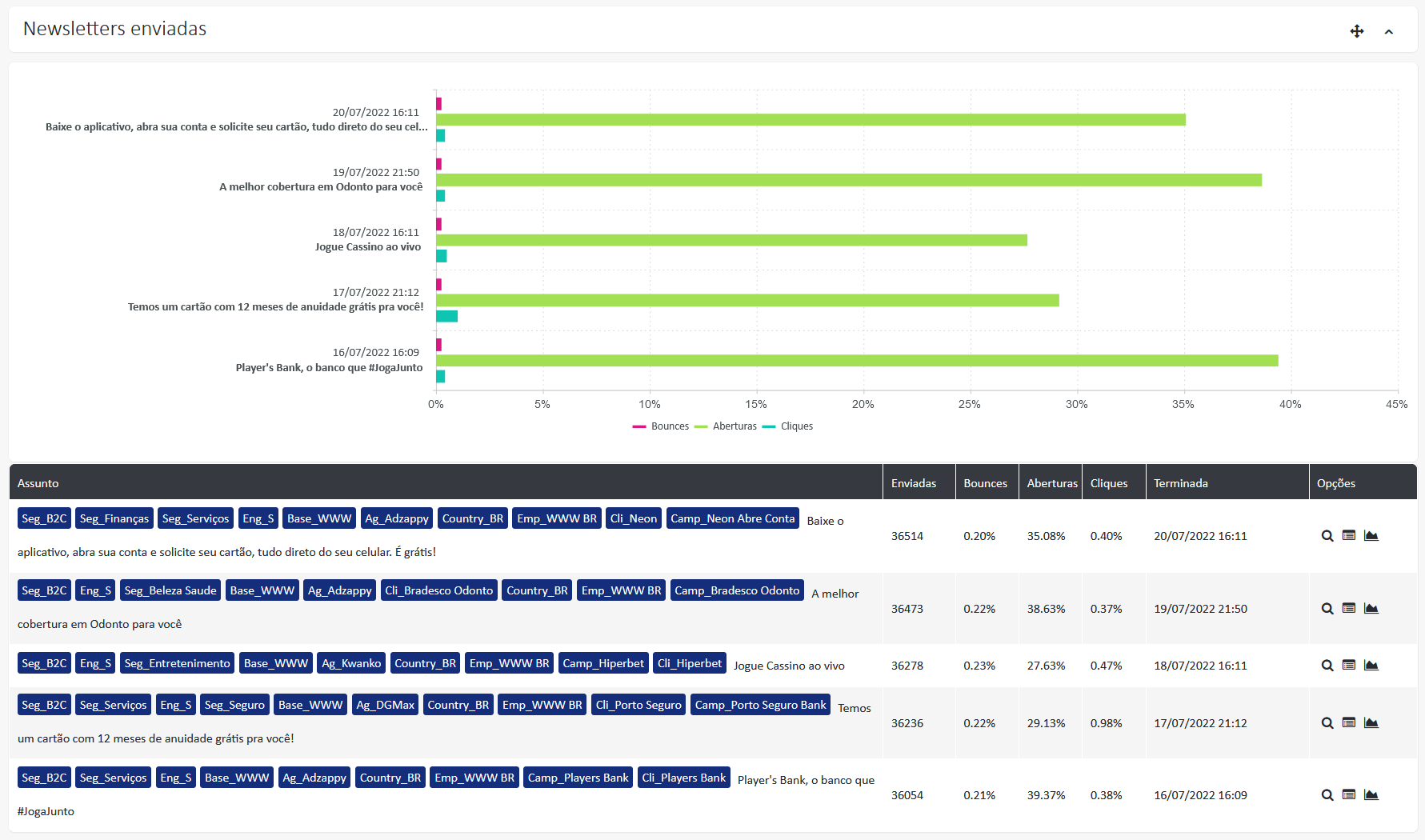 Visualize também campanhas em execução em tempo real e as que foram enviadas na última semana, com estatísticas básicas dos disparos.